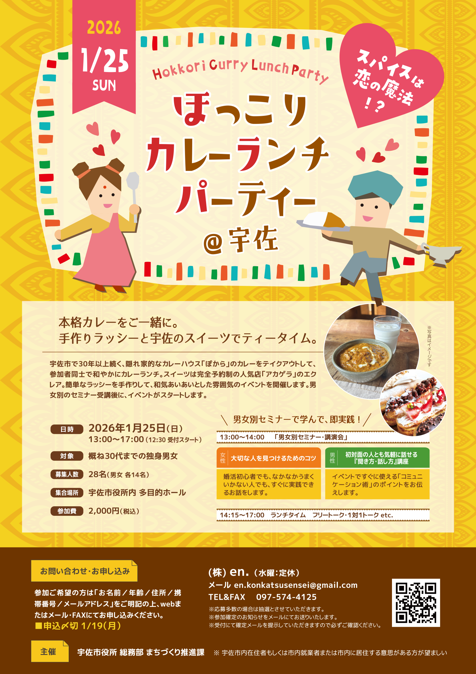 宇佐市で30年以上続く、隠れ家的なカレーハウス「ぽから」のカレーをテイクアウトして、参加者同士で和やかにカレーランチ。スイーツは完全予約制の人気店「アカゲラ」のエクレア。簡単なラッシーを手作りして、和気あいあいとした雰囲気のイベントを開催します。男女別のセミナー受講後に、イベントがスタートします。